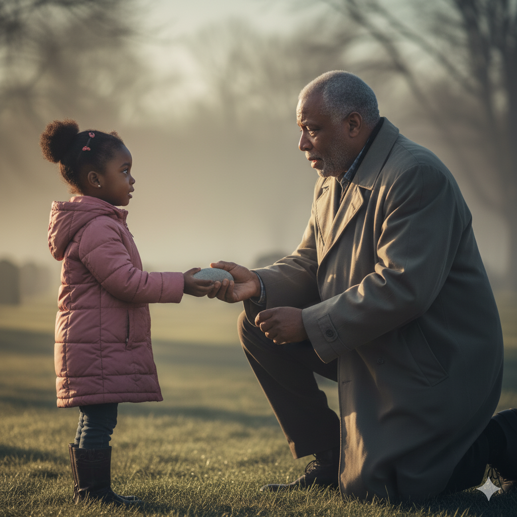 C’est alors qu’une petite fille, qui accompagnait son grand-père dans une allée voisine, s’approcha. Elle avait vu la scène. Sans un mot, elle vint s’accroupir près de Samuel et de son tas de pierres. Elle regarda le vieil homme, puis les cailloux, avec une curiosité tranquille.